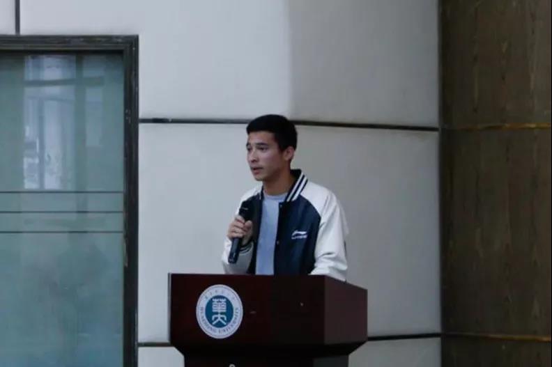 2021级公费师范生阿布都许库尔·麦合木提同学作为运动员代表发言:“训练的过程很辛苦,还要克服来自学习的压力,但正是所有的这些努力才成就了最后的成功。我们将在未来的学习生活中满怀热情、积极进取,将体育精神融入到日常生活中去。”
