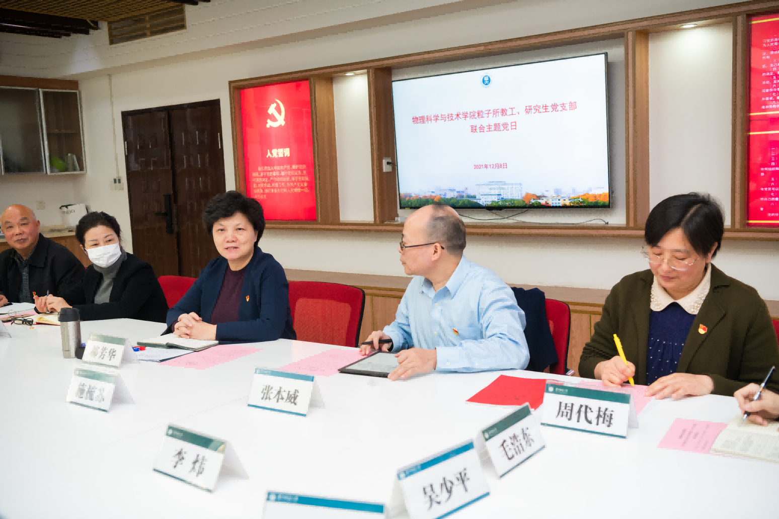 活动期间,粒子所党支部全体党员重温了入党誓词,聆听党章诵读。粒子所教工党支部书记和研究生第一党支部书记分别汇报了党支部基本情况。物理学院主要负责人对学院意识形态工作情况进行了汇报。