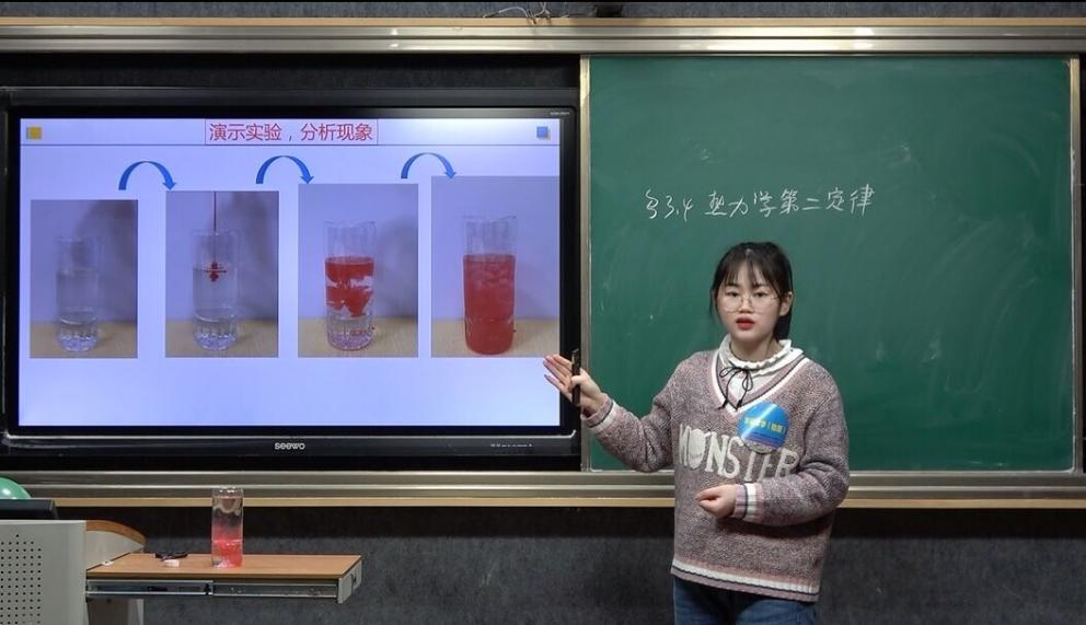 叶梦君在决赛中抽取到的是选修教材中的《热力学第二定律》。她表示,自己对这一课题不够熟悉,在黄致新老师的指导下,她逐渐理清了教学设计的思路,明确了备课方向,最终完成了决赛作品。她说,在完成教学设计和课件制作等前期工作后,如何在教学视频中完美地呈现出来也是一大难点,包括教学逻辑的递进,以及语言节奏的把控和表情管理等问题。在这方面,首要的工作是写好讲课稿以形成基础的框架,更重要的是在练习的过程中不断的调整改进。