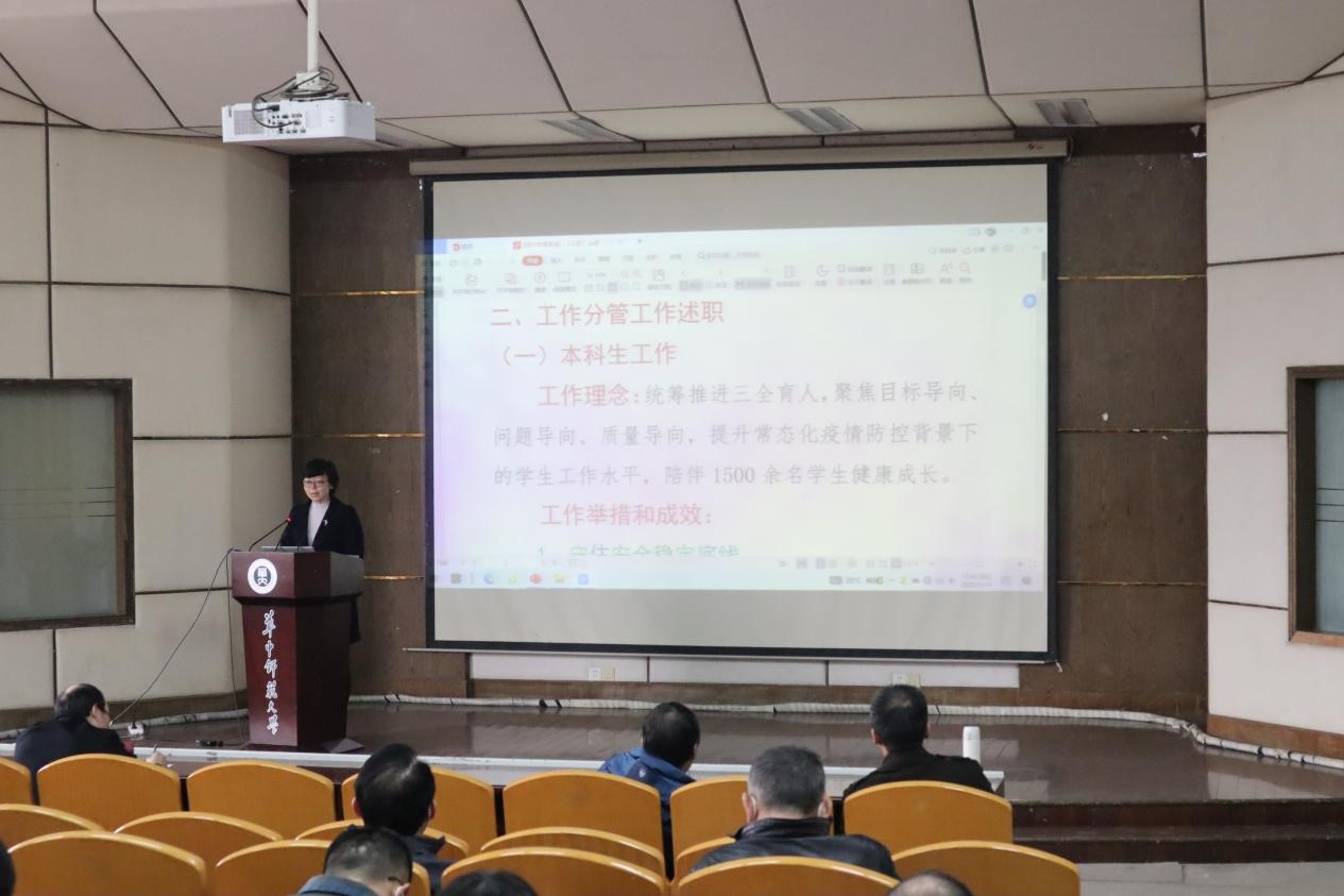 (通讯员 薛舒尹)3月18日下午,我院于九号楼一楼报告厅召开2021年度中层干部述职述廉大会。会议由党委书记张明生主持,我院全体教职工、退休教工及学生代表参加会议。