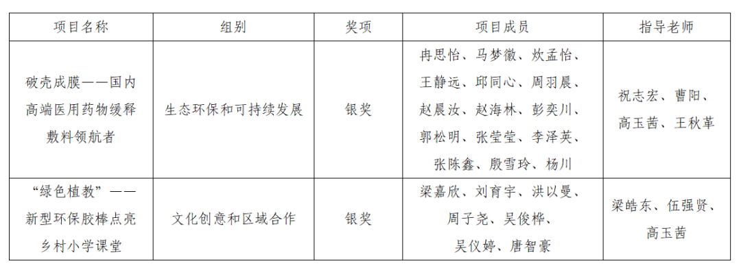 在省赛中,经过材料评审、线上答辩,最终“破壳成膜——国内高端医用药物缓释敷料领航者”项目获得生态环保和可持续发展赛道银奖,“绿色植教——新型环保胶棒点亮乡村小学课堂”项目获得文化创意和区域合作赛道银奖。