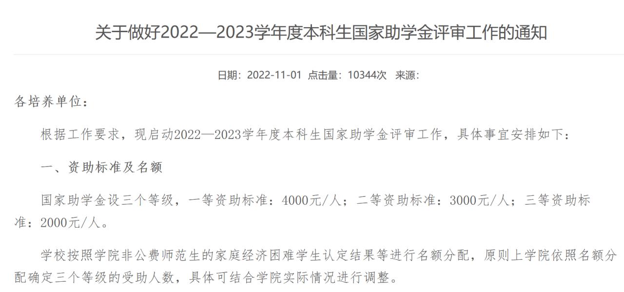 学院根据学校下发《关于做好2022—2023学年度本科生国家助学金评审工作的通知》积极推进2022-2023学年度本科生国家助学金评审工作。根据前期贫困认定结果及学生实际情况、院系摸排等环节,最终确定国家助学金受助名单,包括国家助学金一等69人,国家助学金二等70人,国家助学金三等64人,下发助学金共61.4万元,确保应助尽助。