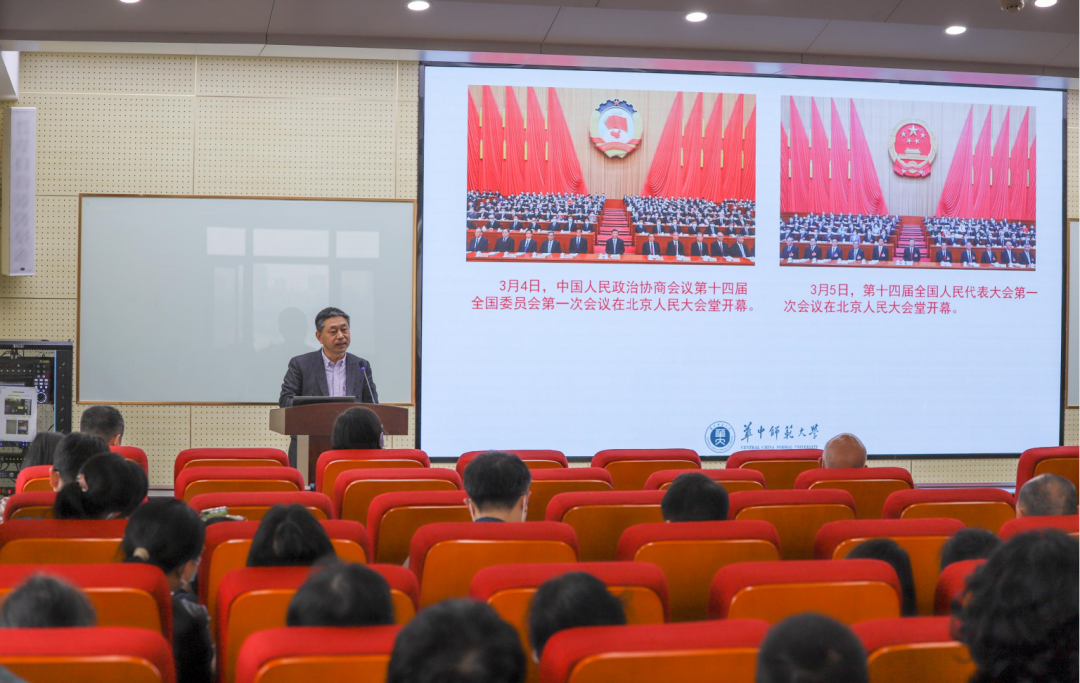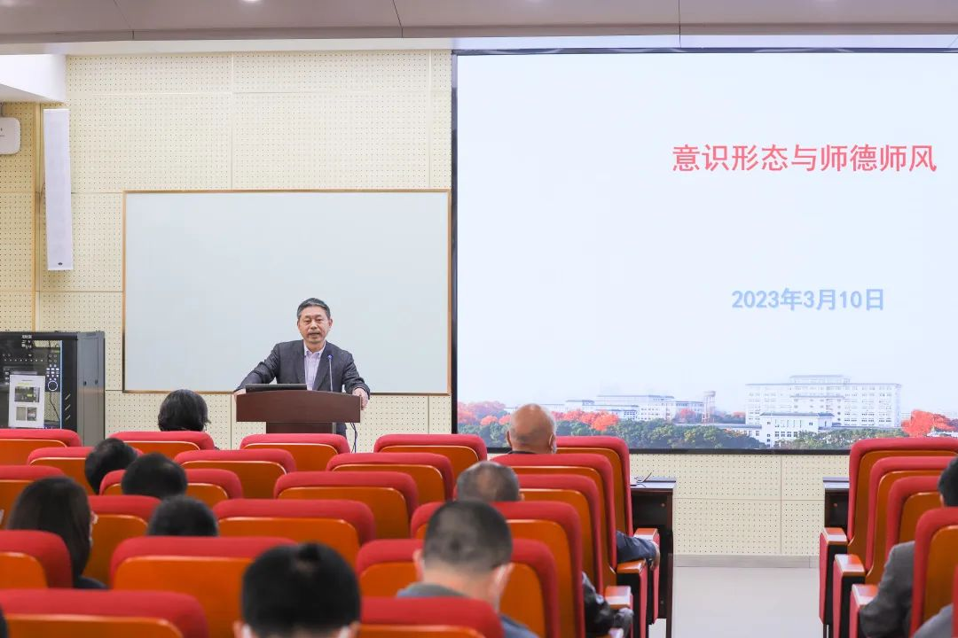 张明生传达了党的二十届二中全会精神,介绍了正在召开的全国两会进程和重要精神。他表示,学院要强化政治引领,贯彻落实会议最新精神,把广大师生的思想认识行动统一到党的二十大精神上,要进一步统一思想、统一意志、统一行动,全体教职工要扎实履行好今年工作职责,推动学院高质量发展。政治理论学习会上张明生还面向全体教职工开展了意识形态与师德师风专项教育,院党委副书记、学院党委纪检委员曹阳传达了湖北省违规吃喝问题专项整治工作要求,要求全体教职工要增强纪律规矩意识,不越纪律红线。