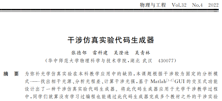 近日,物理科学与技术学院2019级本科生张德邻的论文,干涉仿真实验代码生成器,被《物理与工程》期刊选为特别推荐文章在微信公众号首页推送。《物理与工程》期刊是中国科技核心期刊;是由教育部主管,清华大学主办,教育部高等学校大学物理课程教学指导委员会领导,以高校物理教学与研究以及物理的工程应用为主要内容的学术性刊物。