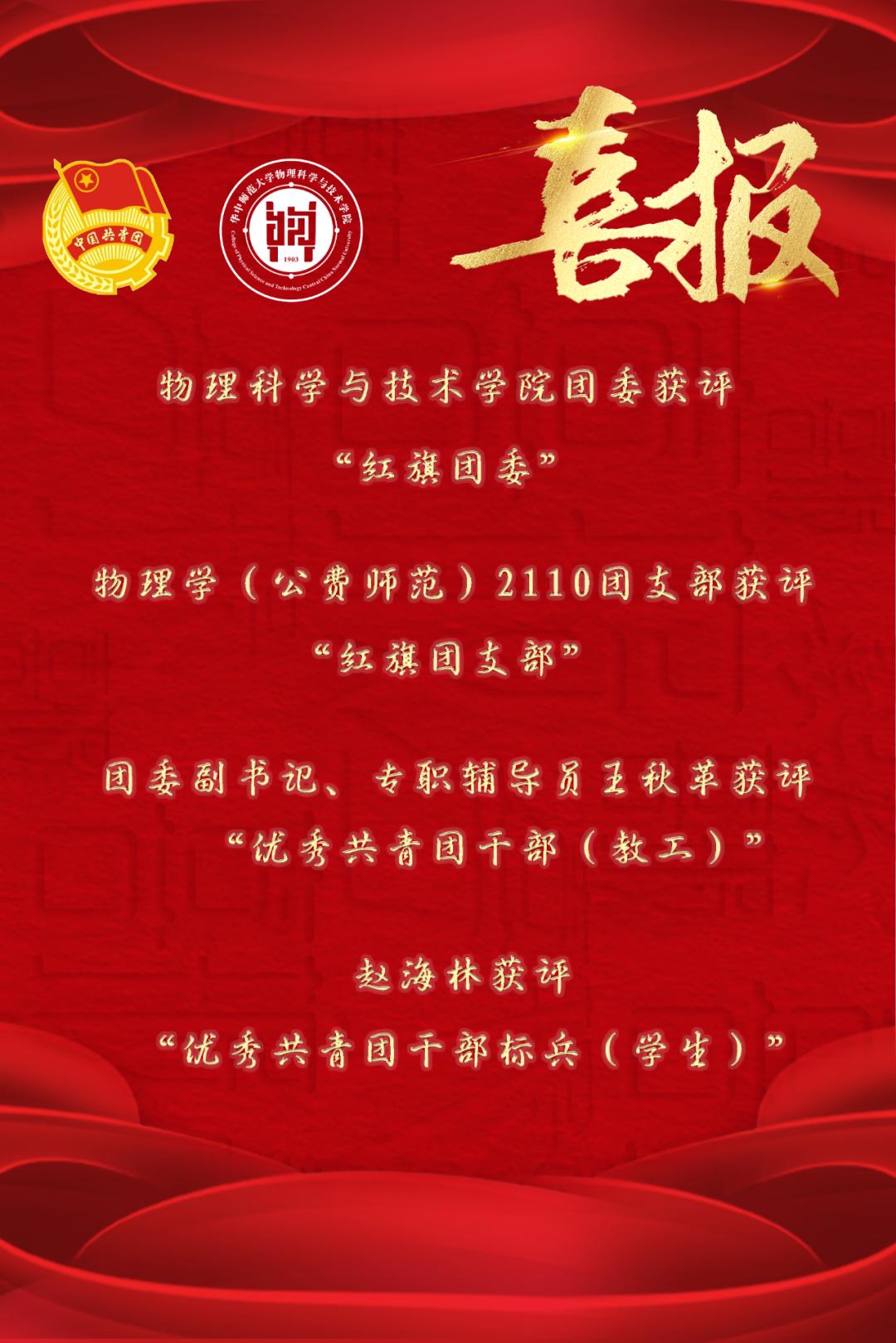 2022年度共青团工作表彰大会暨桂苑之歌五四专场歌友会于5月4日在佑铭体育馆举行。大会上对2022年度优秀个人与先进集体进行了表彰,学院喜获多项荣誉。物理科学与技术学院团委荣获2022年度“红旗团委”称号,物理学(公费师范)2110团支部荣获2022年度“红旗团支部”称号,王秋革老师荣获2022年度“优秀共青团干部(教工)”称号,赵海林同学荣获2022年度“优秀共青团干部标兵(学生)”称号。