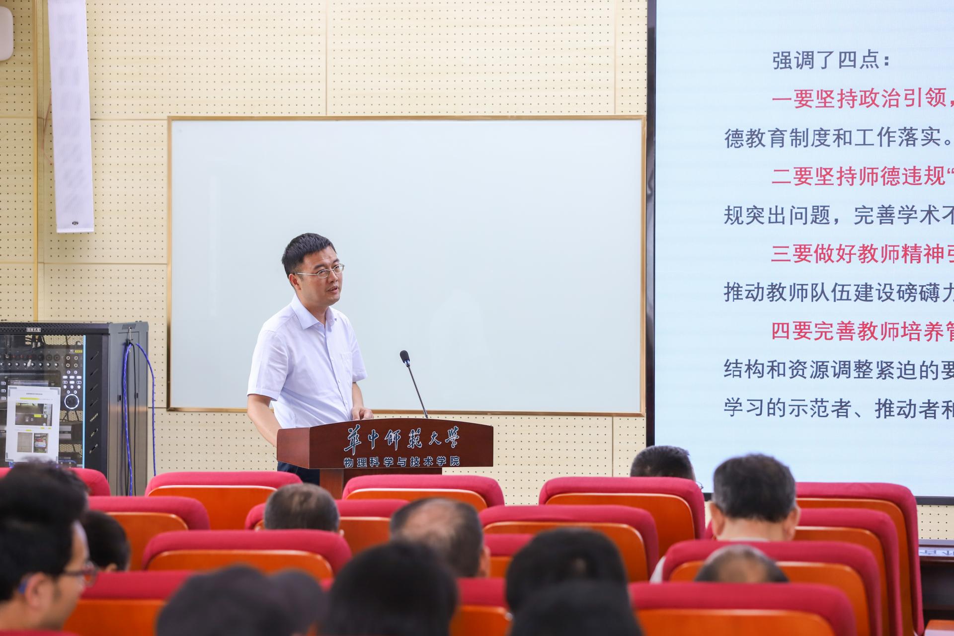 在师德师风教育环节,金新利带领全体教职工重温《新时代高校教师职业行为十项准则》,以教育部公布的师德失范典型案例及网络热点的师德师风案例开展了警示教育。同时用“时代楷模”张桂梅、黄大年、万步炎等先进事迹,希望广大教职工牢记习近平总书记的殷殷嘱托,围绕“立德树人”根本任务,做“四有”好老师、“四个引路人”、“大先生”,为服务国家重大战略需求和推动学校“双一流”建设做出更多贡献。
