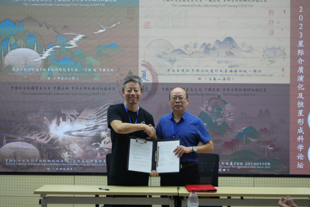 我院党委书记金新利、张本威院长、俞云伟副院长等领导参与了会议。会议开始,张本威院长对我院的学科发展进行了详细介绍,郑小平教授对我院天体物理发展历史进行了回顾,FAST首席科学家李菂研究员对未来和我院天文合作进行了展望。经过讨论,双方一致同意在资源共享、项目申请、实验室建设和人才培养等方面开展深度合作,张本威院长代表我院与FAST多科学目标同时扫描巡天项目组签署了合作意向书。