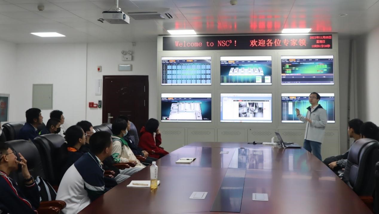 之后,同学们来到了学院的超算中心。华中师范大学核科学计算中心(超算中心)是国内首个主要用于有限温度密度格点量子色动力学研究的大型超算平台。建成之时,其计算性能入选了2018年6月发布的全球Top 500(第389名)和Top Green 500(第13名)。通过管理员的讲解,同学们了解到超算是如何助力探秘“21世纪物理学领域11大未解之谜”中的“超高温或超高密度下的新物质形态”和“宇宙如何诞生”问题的。