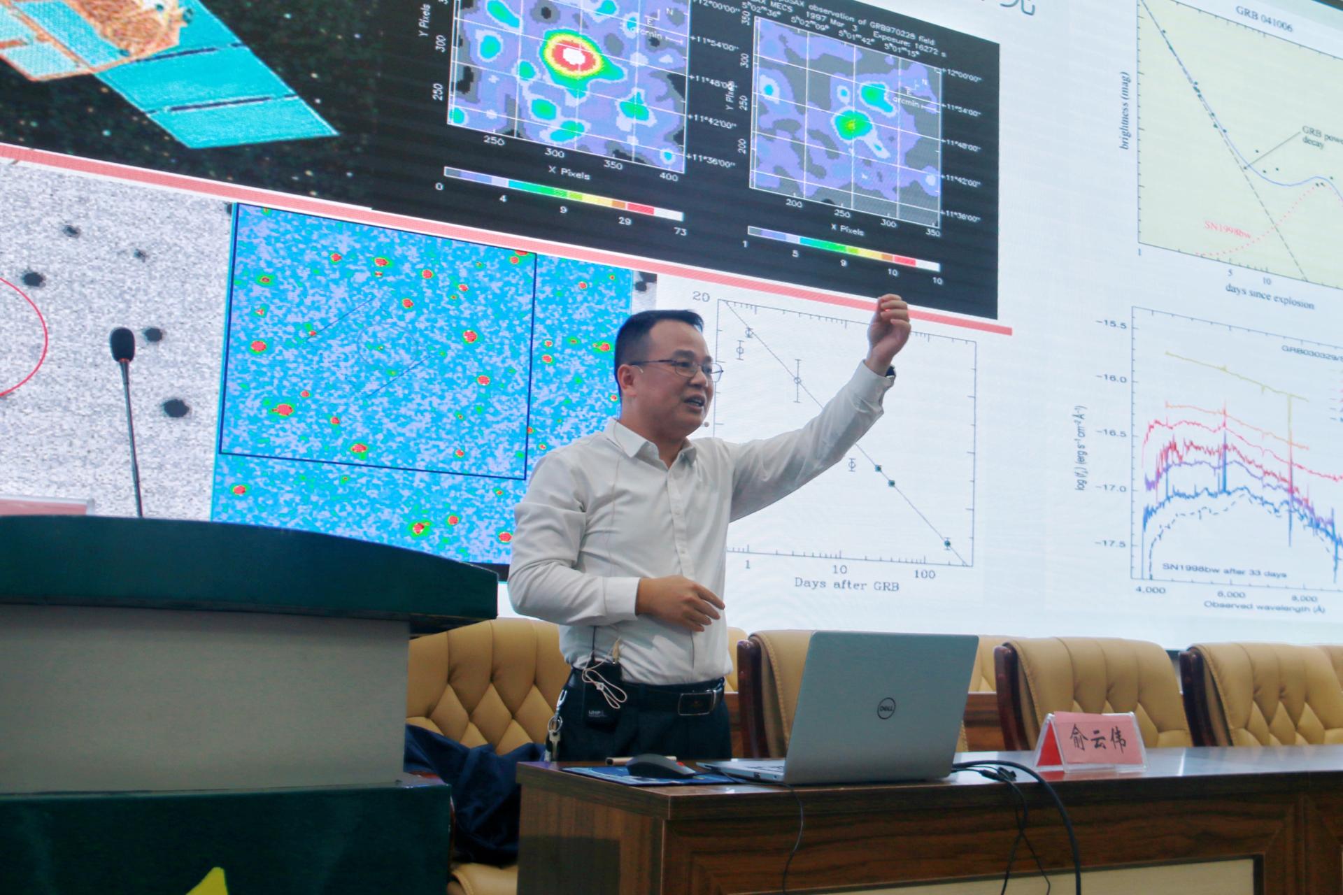 会后,物理学院副院长俞云伟教授为黄陂一中学生做了题为《探秘宇宙中短暂而剧烈的爆发现象》的科普报告。他用简洁生动的语言向同学们介绍了天文学基础知识,展示了迷人的星空图片,并与同学们畅谈了对空间科学充满无限憧憬的探索精神。