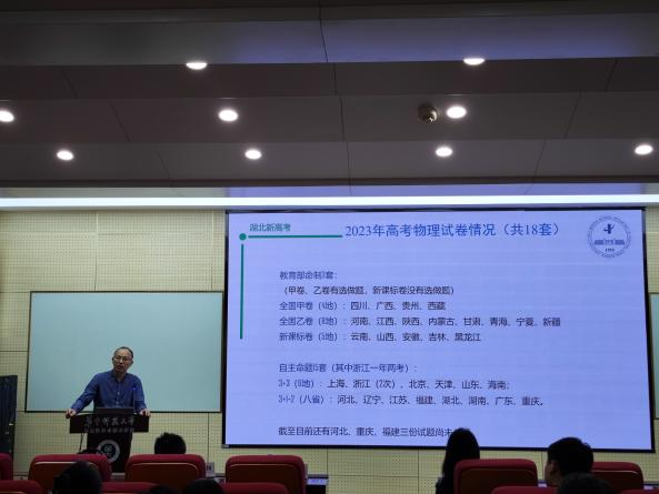 徐明老师是我院1996届物理学硕士,在第六届全国中学物理教学改革创新大赛中获得省一等奖,曾荣获湖北省优秀物理教师等荣誉。徐明老师以《“三新”背景下高中物理教学思考》为题,首先向同学们介绍了华师一附中的办学历程、教学理念和卓越成绩,接着深入解析了“三新”背景下的新课程,新教材以及新高考,从“一核四层四翼”的角度详细讲解了新高考带来的新要求。随后,徐明老师强调了物理课堂中实验教学的重要性,强调教师可以使用多种信息化教学辅助工具帮助提升课堂教学质量。最后,徐明老师系统讲解了“一堂好课”的制作流程,包括备课、说课、试上、磨课、上课、点评和反思等环节,让同学们从中深刻领会到了物理教学工作的系统性和严谨性。