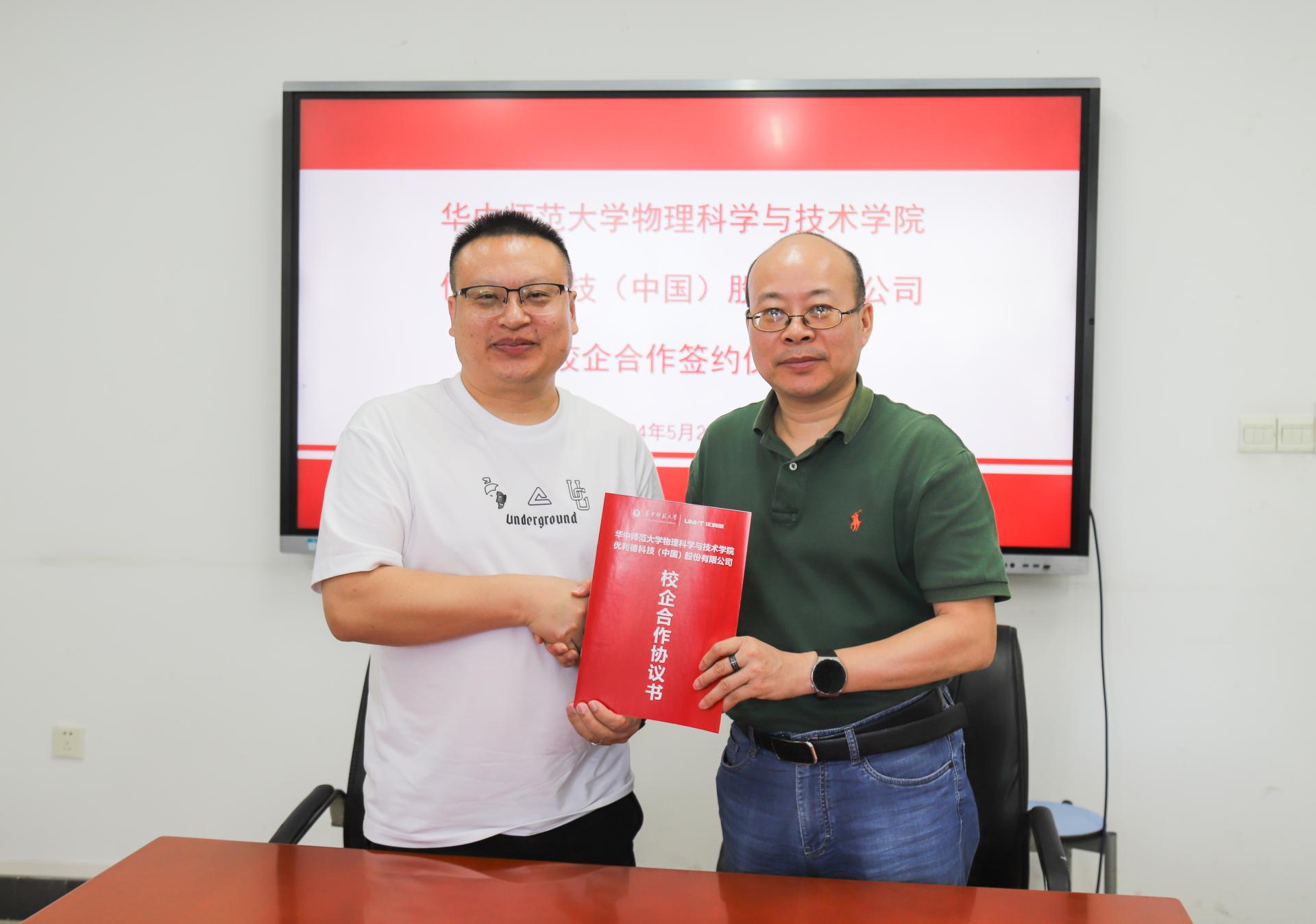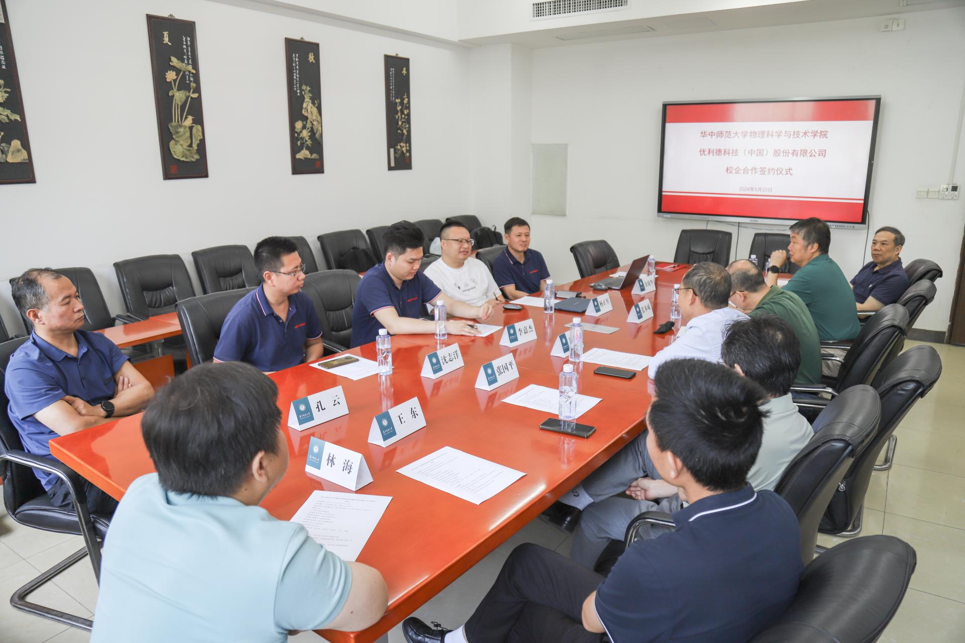 为探索多元化校企合作模式,积极推进产学研深度合作,促进研究生培养、本科生实习和毕业生就业,5月23日,优利德科技(中国)有限公司与华中师范大学物理科学与技术学院在华中师范大学九号教学楼535会议室举行校企合作签约仪式。优利德公司人力资源总监杨正军、华中区销售总监金战华、仪器市场部经理李嘉杰、华中区销售经理沈志洋和华中师范大学物理科学与技术学院院长张本威、副院长黄光明、吴少平、电信学科专业教师骨干刘守印、张国平、王东、林海等参加签约仪式,交流会由黄光明主持。