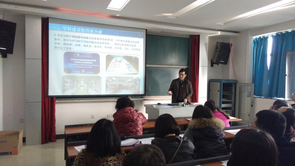 院分党委书记陈迪明代表院领导班子作《物理学院领导班子2015年述职报告》。陈迪明书记从学科建设、科研工作、队伍建设、人才培养、党建管理五个方面汇报了我院2015年各项工作开展情况。我院领导班子坚持打造“学习型、创新型、效能型、务实型、廉洁型”的五型领导团队,形成了“党政一体、目标一致、分工协作、团结进取”的良好氛围。2015年,我院围绕“建设一流学科,打造一流学院”,各项工作取得突破性进展,“夸克物质及其探测技术国际联合研究中心”成功入选2015年度国家级国际合作研究机构,实现我校国家级国际合作研究机构零的突破;全年学院教师论文入选ESI高水平论文14篇,全年举办13次影响力较大的学术会议;学生获奖的数量和质量创历史新高,人才培养继续国际化;党建文化品牌建设受到校内外广泛关注,得到省委副书记张昌尓高度评价。陈迪明书记还对我院2016年工作计划及个人履职情况进行了汇报。