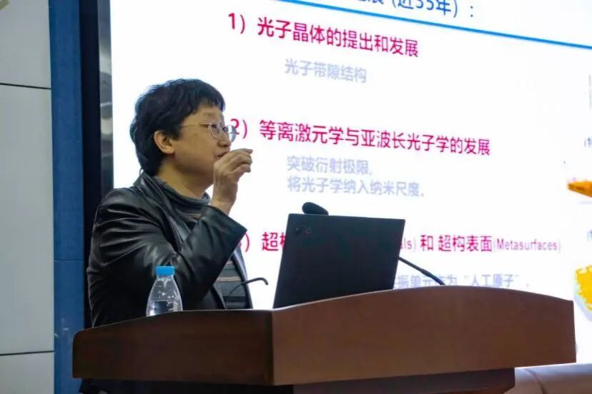 作为微纳光学领域的领军学者,南京大学特聘教授彭茹雯率先带来“人工结构调控光偏振态及其应用”主题报告——其相关研究成果曾入选“2023中国光学十大进展”,偏振态调控本身正是经典光学系统与现代光子技术领域的核心环节。报告中,彭茹雯介绍道,团队曾与研究组合作,成功构造出无序反转超构表面——这种材料兼具漫反射特性与清晰成像能力,如同“会透光的毛玻璃”,一举打破了传统光学器件的性能局限。她还介绍了武汉地区在微纳光学领域的突出贡献,重点分析了无序反转反射表面、透明哑光材料等成果,凸显了荆楚科研力量的优势。