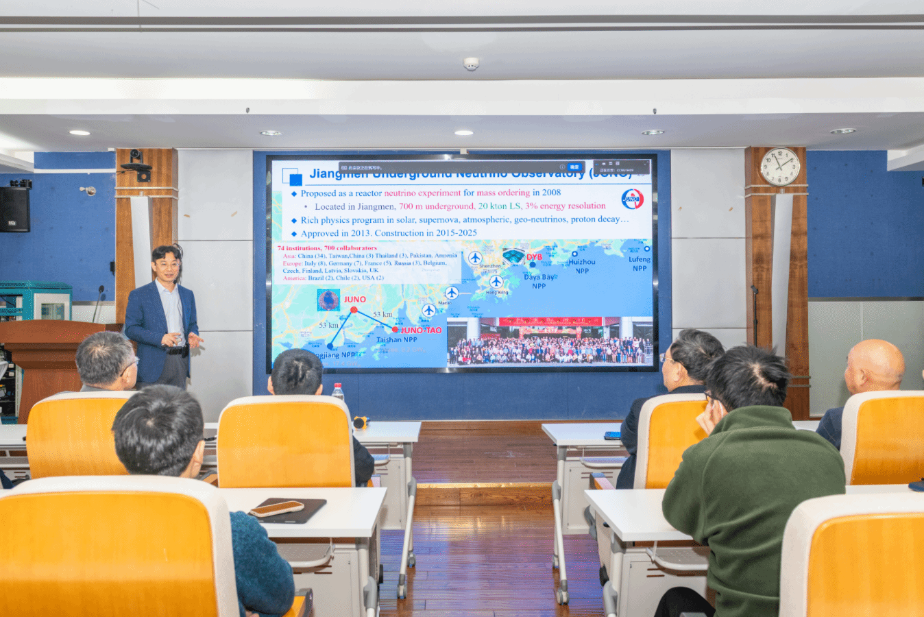 在专题研讨环节,曹教授与青年学者们深入交流了中微子质量顺序测量、反应堆中微子能谱反常等前沿问题。曹教授强调:“JUNO不仅将解决中微子质量顺序这一核心问题,还将作为多物理目标的探测平台,在超新星中微子、太阳中微子、地球中微子等研究领域产生国际领先的成果。”现场师生围绕探测器关键技术、台山中微子实验(TAO)与JUNO的协同研究等话题展开了热烈讨论。