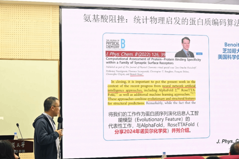 李敬源教授的报告从“低信号高噪声的生物大分子系统中如何捕捉关联行为”这一核心科学问题切入,系统介绍了其团队发展的关联统计分析方法与分子动力学模拟技术。报告聚焦于固有无序蛋白、生物大分子凝聚相等前沿体系,揭示了生物大分子在非平衡过程中丰富的关联行为,提出了环境驱动下关联行为涌现的物理机制。