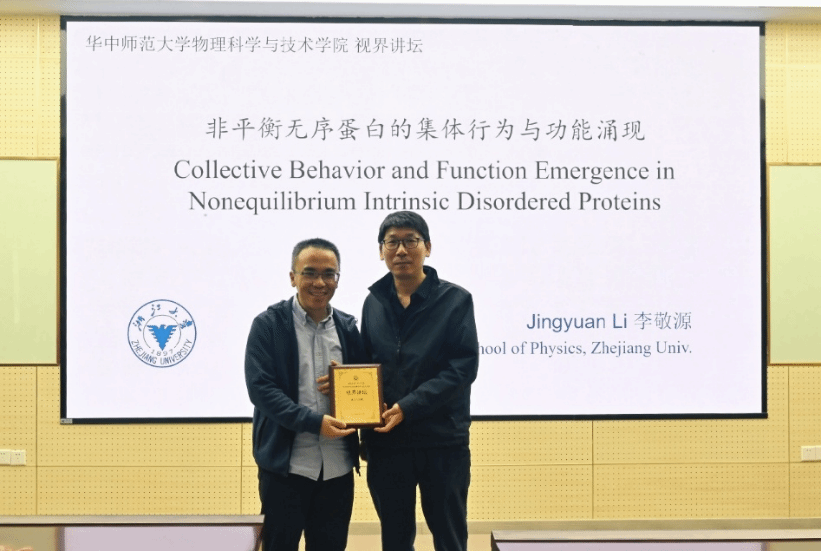 4月21日,浙江大学李敬源教授应邀做客华中师范大学物理科学与技术学院第二十八期“视界讲坛”,在九号楼9557教室为我院师生作题为“非平衡无序蛋白的集体行为与功能涌现”的专题讲座。物理科学与技术学院院长秦广友教授为李敬源教授颁发“视界讲坛”主讲人聘书,讲座由物理科学与技术学院副院长赵蕴杰教授主持。