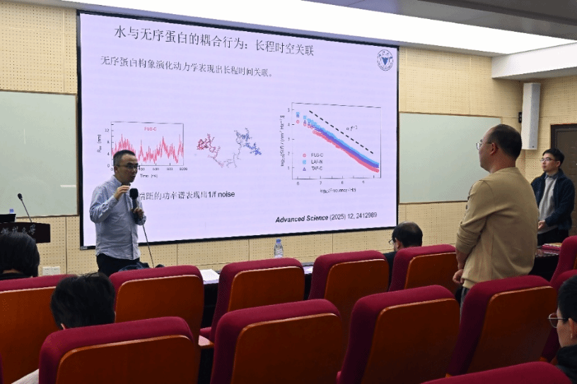 交流互动环节,现场师生踊跃提问,围绕固有无序蛋白的构象动力学建模、生物大分子凝聚相的相分离机制,以及分子动力学模拟中关联行为的量化分析方法等问题与李敬源教授展开了深入探讨。李敬源教授强调:“生物大分子系统的非平衡关联行为,是连接微观分子相互作用与宏观生物功能的关键桥梁,也是当前交叉学科研究中极具挑战与魅力的前沿领域。”