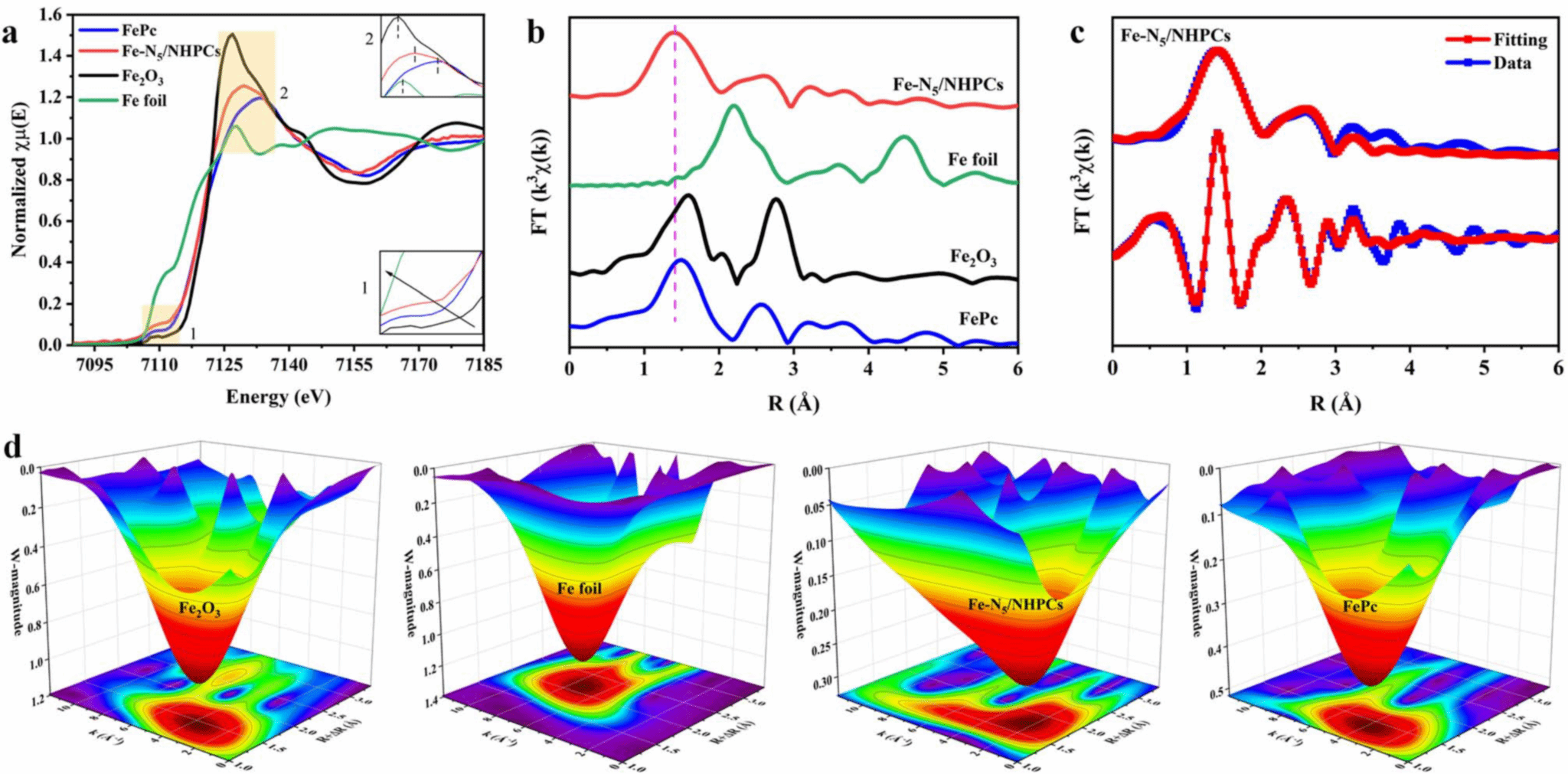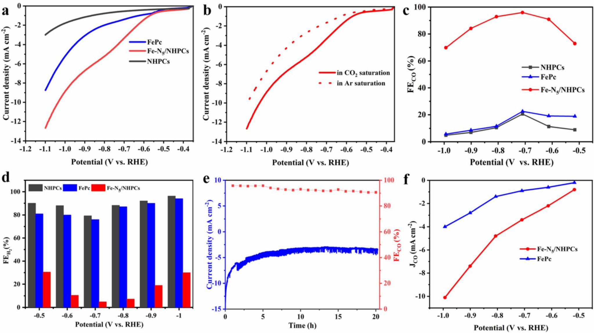 该工作首先采用理论计算手段探讨了系列Fe-N4类催化剂对于电催化CO2RR的性能,发现具Fe-N5构型的二维层状结构(Fe-N5/NHPCs)有着优异的CO2RR的性能(图1)。然后通过一种无热解的共掺杂策略来合成轴向N配位的Fe-N5原子构型,X射线吸收精细结构谱(XAFS)分析确定了Fe-N5催化剂的成功合成(图2)。轴向N配位的引入打破了FePc中Fe-N4位点的对称性,诱导Fe-N5位点的电子局域化,增强了CO2的吸附和活化,从而提高了Fe-N5/NHPCs的催化性能。XPS和XAS分析显示Fe原子的能量负移,表明Fe-N5/NHPCs中的氧化态(+1.62)低于FePc(+2.0),这归因于轴向N配体向Fe中心的电子转移。结构表征证实了单个Fe原子与五个N原子配位,具有扭曲的D4h局域对称性。因此,Fe-N5/NHPCs催化剂表现出优异的CO2RR选择性(FECO=96%)、活性(3.6mAcm-2在-0.7V)和稳定性(20h),同时具有较低的Tafel斜率(233mVdec-1)和较高的TOF(5283h-1)(图3)。这些发现提供了一种新颖的策略来调整Fe和其他金属中心的局部配位环境以增强CO2RR,并启发了Fe-SACs之外的金属-N5结构的设计。