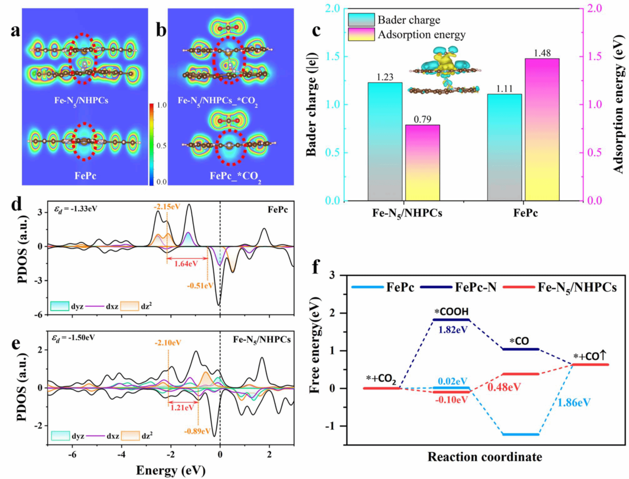 铁酞菁(FePc)具有典型的二维平面对称结构,其Fe–N₄位点因具有对称的电子分布,导致CO₂向CO转化的选择性较低。理论计算表明,在Fe–N₄中心引入轴向配位的氮原子可打破电子密度的对称性,促进电子向CO₂分子转移。这一调控不仅增强了CO₂的吸附与活化能力,同时降低了关键中间体CO与活性位点的相互作用。为验证该机制,本研究采用一种简便的无热解共掺杂策略,成功构建了轴向氮配位的Fe–N₅结构,并确认其作为催化反应的活性位点。所制备的Fe–N₅结构在电催化CO₂还原反应中表现出优异的CO生成性能,实现了96%的选择性以及高达5283 h⁻¹的转化频率(TOF)。本研究为通过无热解手段优化活性位点的局域微环境以提升催化性能提供了可行策略。