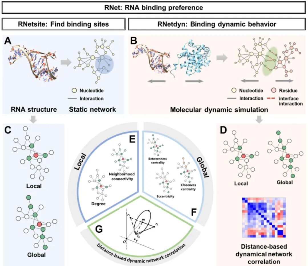 (A)RNA分子结构和(B)RNA复合物动力学轨道被转化为网络。(C)基于机器学习的网络算法利用局部和全局特征预测RNA结合位点。(D)基于距离的动态图算法准确描述复合物结合界面的动力学行为。(E, F)局部和全局网络特征。(G)基于距离的动态网络相关系数。