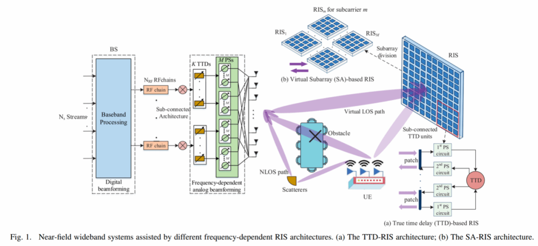 王骥副教授课题组聚焦第六代移动通信(6G)关键技术之一的智能超表面(RIS)领域,创新性地提出了用于RIS辅助近场通信的宽带波束成形方案。针对近场宽带通信中存在的“双波束分裂”效应,研究团队在基站侧引入了基于子连接真时延(TTD)单元的频率感知混合预编码架构,并在RIS侧提出了两种新型频率感知被动波束成形架构:基于真时延的RIS(TTD-RIS)和基于虚拟子阵列的RIS(SA-RIS)。