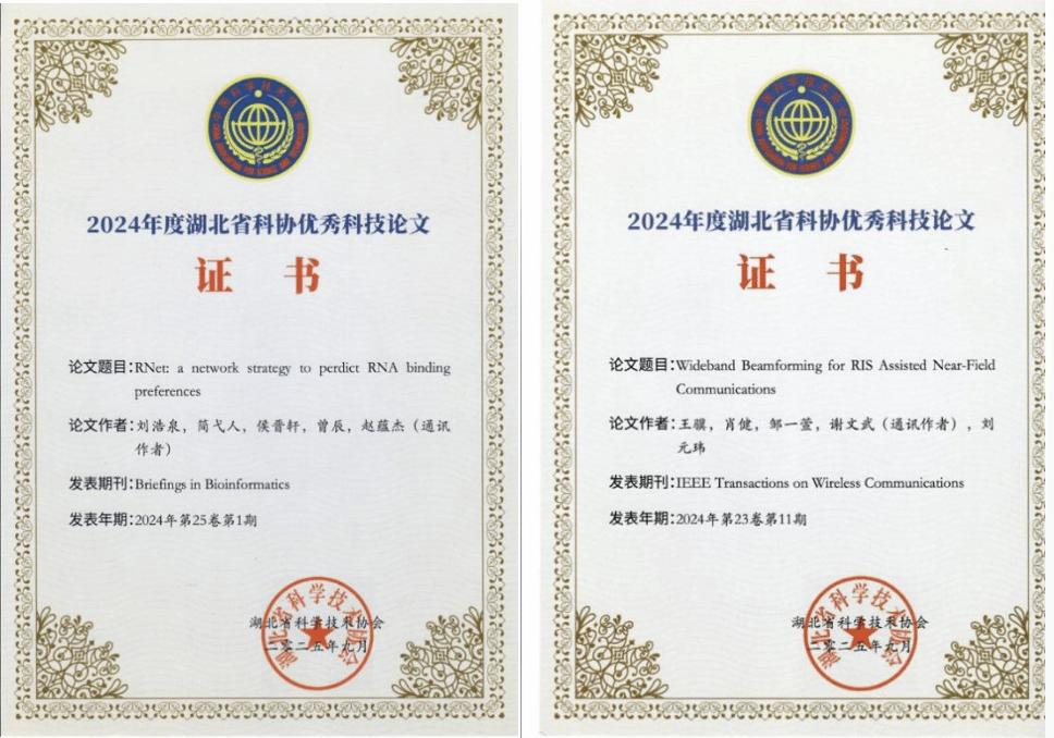 为激励湖北省科技工作者潜心基础研究与技术攻关,产出更多高水平、原创性科技成果,湖北省科协根据《省科协关于开展2024年度湖北省科协优秀科技论文遴选工作的通知》(鄂科协办〔2025〕48号)要求,开展2024年度湖北省科协优秀科技论文遴选工作。该工作旨在发掘并表彰在学术界具有广泛影响力、在科技前沿实现关键突破与建树、对原始创新发挥引领作用的优秀科技论文。此次,物理科学与技术学院两篇高水平论文成功入选2024年度湖北省科协百篇优秀科技论文,分别为赵蕴杰教授课题组在期刊 Briefings in Bioinformatics(中科院一区)发表的成果,以及王骥副教授课题组在期刊 IEEE Transactions on Wireless Communications(中科院一区)发表的成果。