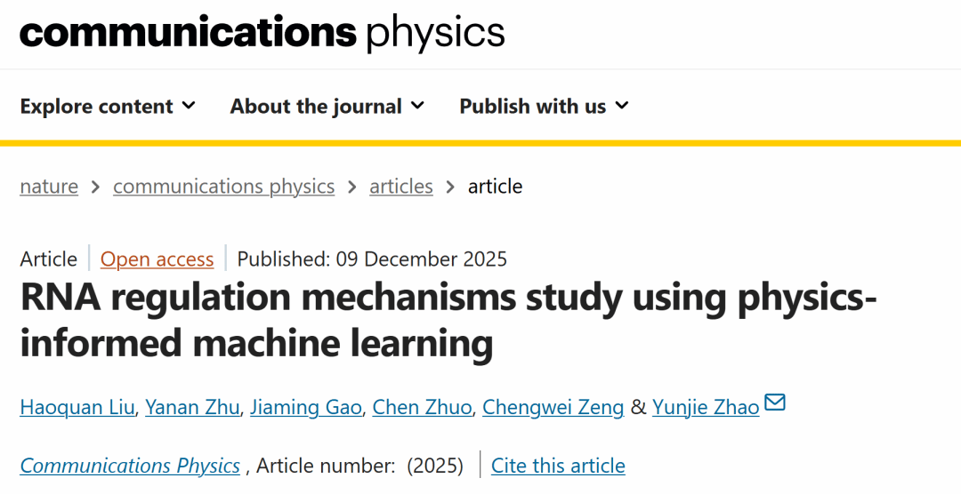 近日,物理科学与技术学院赵蕴杰教授课题组与浙江大学物理高等研究院朱亚南研究员团队合作在自然系列子刊《通讯 物理》(Communications Physics)发表了最新研究成果“RNA regulation mechanisms study using physics-informed machine learning”,提出了基于物理知识引导的机器学习计算框架ZHMolRM (RNA Mechanism),为解析RNA复合体的动态调控机制提供了新思路。研究内容被中国生物物理学会作为科技前沿报道。