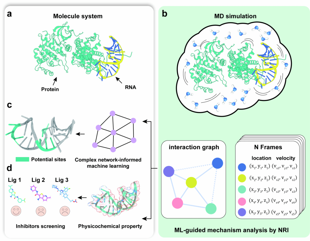 针对这一关键科学问题,赵蕴杰教授团队提出了物理知识引导的机器学习计算框架ZHMolRM (RNA Mechanism),为解析RNA复合物的动态调控机制提供了新思路。该方法首先基于神经关系推断(NRI)的模型,从分子动力学模拟中挖掘RNA复合物在动态过程中的潜在结构域相互作用(图1a、1b),并结合复杂网络驱动的算法RNet精确识别关键功能区域(图1c)。NRI模型通过最小化重构轨迹与模拟轨迹之间的误差来学习网络动力学,将核苷酸–氨基酸残基的潜在相互作用作为隐变量进行推断,从而捕捉构象变化中的关键因素。在此基础上,团队进一步整合自主开发的、融合物化约束的小分子抑制剂筛选模型 ZHMol-RLinter,实现从机制解析到调控策略设计的贯通(图1d)。