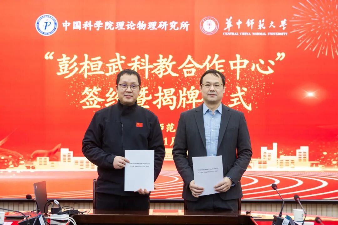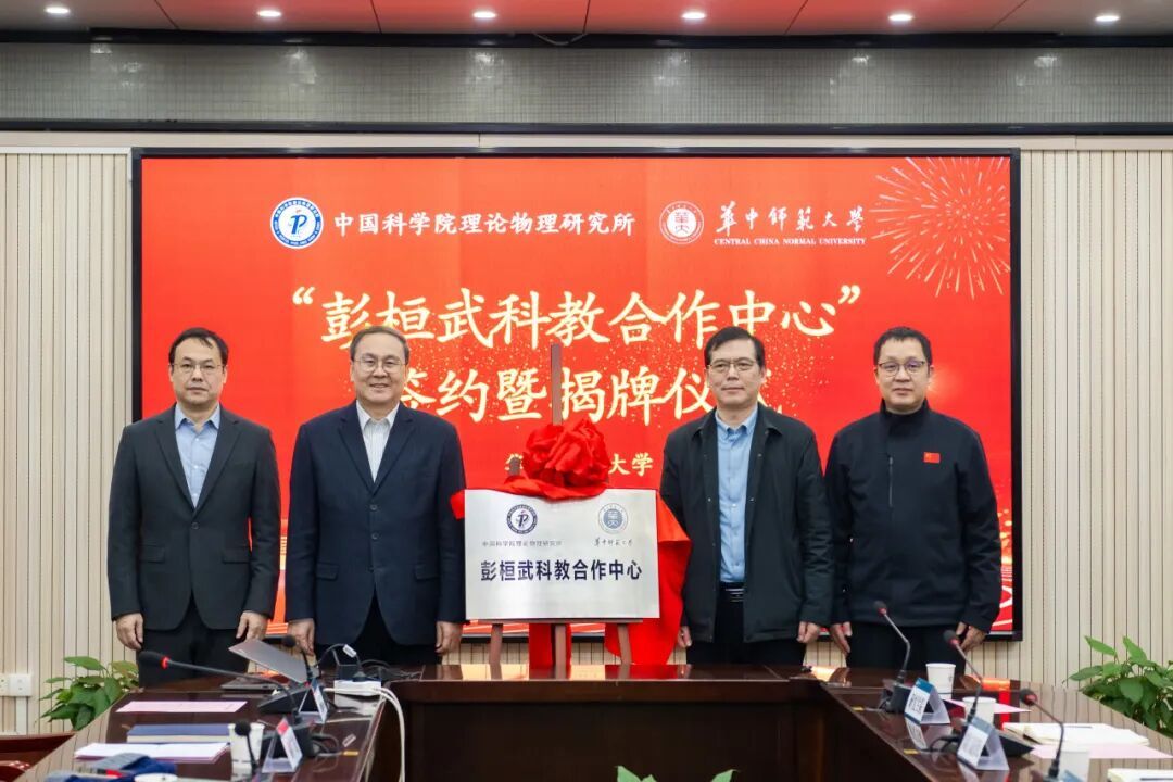 1月20日,我校与中国科学院理论物理研究所共建“彭桓武科教合作中心”签约暨揭牌仪式在行政楼一楼会议室举行。中国科学院理论物理研究所副所长苏刚、副所长周宇峰、研究员王颖丹、科研处副处长冯旻子,华中师范大学党委副书记陈迪明、副校长刘三女牙,人事处、科技处、本科生院、研究生院、实验室与设备管理处等职能部门负责人及物理学院党政班子、教师代表出席。仪式由物理学院院长秦广友主持。