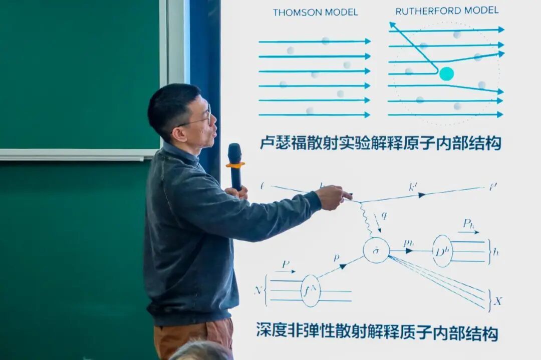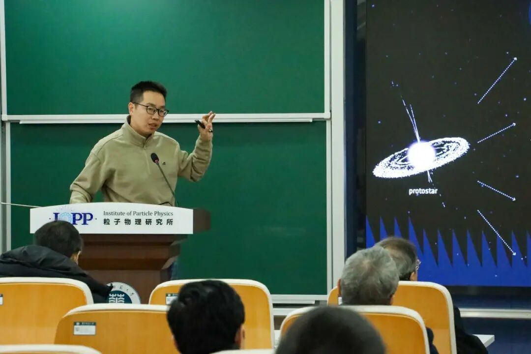 在学术报告环节,六位专家学者依次登台分享前沿成果。赵蕴杰教授率先带来“AI赋能软物质生物分子研究”成果的报告,展现了人工智能在解析生物分子结构、助力靶向药物研发中的关键作用。李新强教授作题为“面向高亮度LHCb和Belle II实验的重味物理理论和唯象研究”的报告,为高亮度下的重味物理实验分析提供核心理论支撑与预测方法。王颖丹研究员分享了“量子开放系统的少体相变研究”,揭示了开放量子环境下少体系统相变的演化路径与调控机制。刘良端研究员聚焦于“时域天文时代光学暂现源的能源机制研究”,结合观测数据剖析光学暂现源的能量起源与爆发过程。庞龙刚教授向大家介绍了“物理信息神经网络在高能核物理中的应用”,展示了AI计算方法在求解复杂核物理方程中的突破。柯伟尧教授介绍了“强相互作用物质中高能部分子的动力学”方面的研究,分析了高能部分子在核物质中的输运机制与能量损失规律。这一系列报告覆盖了粒子物理与核物理、量子科学、天体物理等前沿领域,凸显学科交叉活力,引发师生热烈讨论。