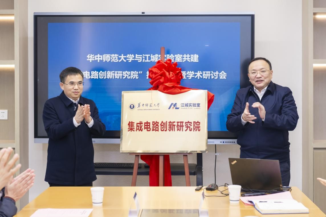 1月21日,华中师范大学与江城实验室联合共建的“集成电路创新研究院”揭牌仪式暨学术研讨会在物理科学与技术学院10楼会议室举行。江城实验室主任杨道虹、华中师范大学党委书记夏立新,华中科技大学、武汉大学集成电路学院负责人,我校科技处、专业学位管理中心、实验室与设备管理处等职能部门负责人,物理科学与技术学院班子成员及相关学科教师代表参会。物理学院党委书记金新利主持会议。