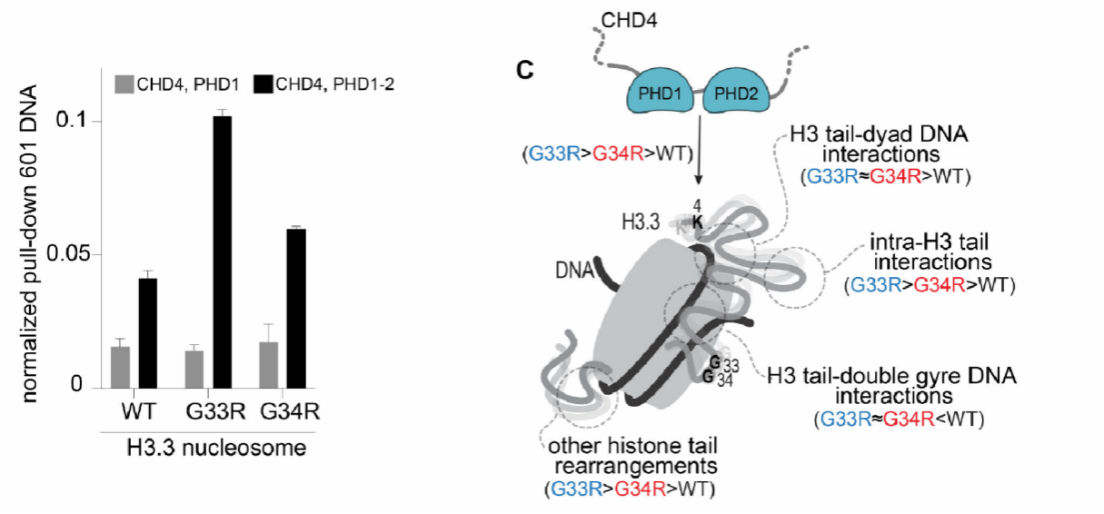 图1.H3.3 G34R突变调节组蛋白尾与DNA的结合模式、构象状态及 DNA 可及性,进而影响染色质重塑蛋白等调控因子的结合行为。