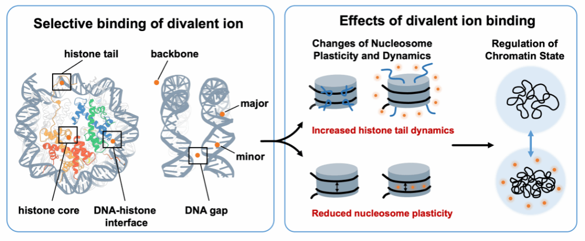 二价阳离子在染色质结构维持及其功能调控中发挥重要作用。作为染色质的基本结构单元,核小体对离子微环境变化高度敏感,其结构与物理化学性质可受到显著影响。尽管单价盐离子对核小体动态结构调控的研究已相对丰富,但从原子尺度系统揭示二价阳离子与核小体相互作用机制的工作仍然不足,尤其是二价阳离子如何调控核小体结构与动力学过程的物理机制尚不清晰。由于核小体具有显著构象柔性,且组蛋白尾部与 DNA 之间存在复杂静电相互作用,传统实验手段难以解析离子结合引发的细微结构与动力学变化,从而限制了对离子介导染色质可及性调控机制的深入理解。