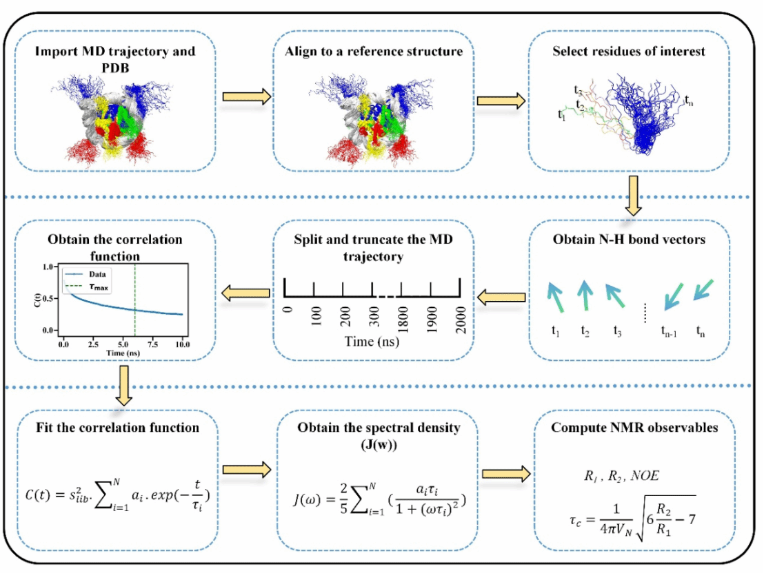 图3. MD2NMR工作流程示意图:从分子动力学轨迹出发,计算相关原子矢量的时间自相关函数,并通过多指数模型拟合获得谱密度函数;随后据此计算 NMR 弛豫参数,从而实现与实验NMR数据的直接比较。