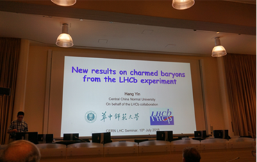 我校物理学院谢跃红教授、尹航教授、博士后俞洁晟(现已出站任湖南大学助理教授)、博士生徐梦琳对这两项新成果作出了突出贡献。7月10日,尹航教授应邀代表LHCb合作组在欧洲核子研究中心举行了题为“LHCb实验粲重子研究的最新结果”的学术报告会(CERN Seminar),重点介绍了双粲重子的研究进展。