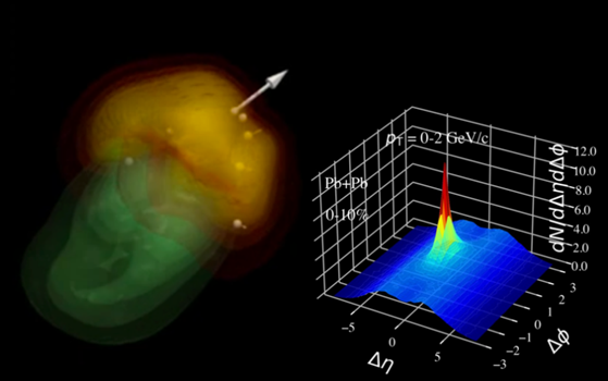 图表 1 模拟的重离子碰撞中由喷注诱导的马赫波的3维图像。右图为强子相对喷注在方位角和快度的2维关联。(研究小组供图)