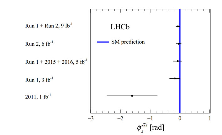 图 1. LHCb实验对ϕ^(ss ̅s)测量结果的演变,标记Run2的结果为此次基于二期运行数据得到的结果,标记Run1+Run2的为基于一期与二期数据得到的平均结果。