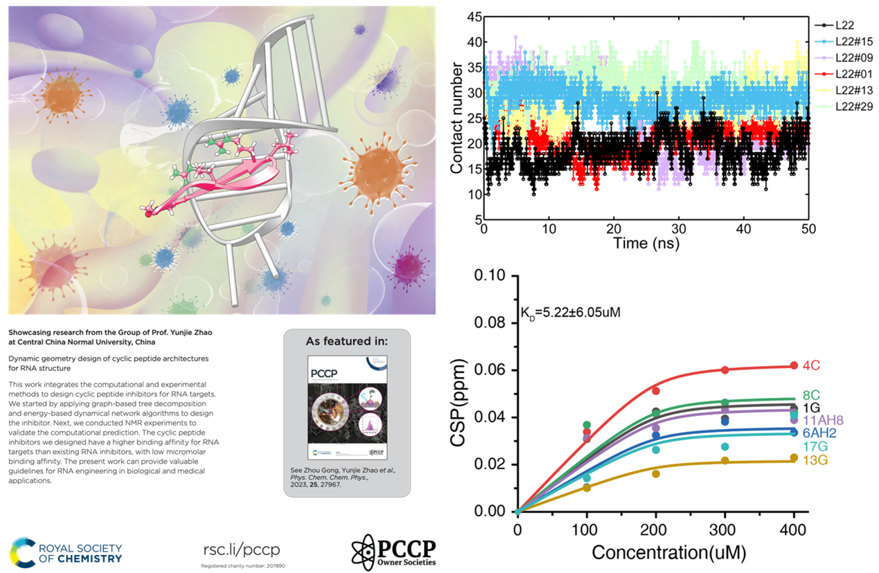 图1.左图为Physical Chemistry Chemical Physics的封面介绍。右图为环状肽分子的理论模拟和核磁共振光谱实验结果,该图表明设计的环状肽分子与靶标RNA有较强的结合能。