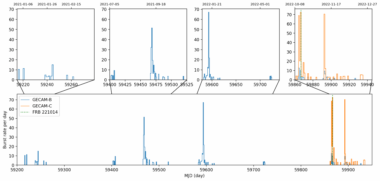 GECAM项目是我国近年来发射的一组空间天文卫星,旨在对伽马射线暴、引力波高能电磁对应体、磁陀星爆发等爆发天体源开展监测研究。GECAM项目由中国科学院“空间科学(二期)”战略性先导科技专项部署研制,两颗GECAM卫星于2020年12月发射运行。我院俞云伟教授深入参与了GECAM项目自立项到运行以来的相关科学研究工作,与中国科学院高能物理研究所的GECAM团队在科研和人才培养方面保持着密切的合作关系(包括共同承担了1项国家重点研发计划项目),此次取得的研究进展便是在这些长期合作下所产生的成果。
