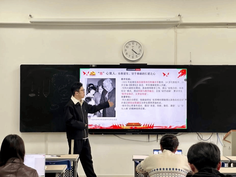随后,支部以“严学笃行,济学兴邦,慈心育人”为主题,宏微并进地开展了“教育家精神”第一期理论专题学习。熊泽坤同志通过讲述严济慈先生“科学救国、教育兴邦”的感人事迹,生动展现了老一辈教育家所兼备的理想信念、道德情操、育人智慧、躬耕态度、仁爱之心、弘道追求等六大特质。当讲到严济慈先生在战火中坚持办学、培养科技人才的事迹时,许多党员同志深受触动和启发,现场响起阵阵掌声。