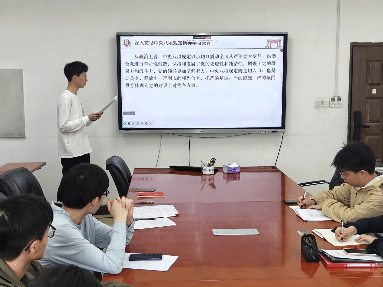 本次党日活动由第四党小组刁宇轩同志领学。支部同志在刁宇轩的带领下学习领会了习近平总书记在中共中央政治局第二十次集体学习时的重要讲话精神,结合实际案例进行了深度学习;扎实开展深入贯彻中央八项规定精神学习教育,持续推进学查改;学习贯彻习近平总书记在庆祝中华全国总工会成立100 周年暨全国劳动模范和先进工作者表彰大会上的重要讲话精神。结合党史学习、时政分析对劳模精神、劳动精神、工匠精神有了更加深刻的认识;认真学习了习近平总书记重要文章《激励新时代青年在中国式现代化建设中挺膺担当》,支部同志进一步明确了将个人未来发展融入民族复兴伟业的人生方向,进一步坚定了为推进强国建设、民族复兴伟业接续奋斗的前进信心。