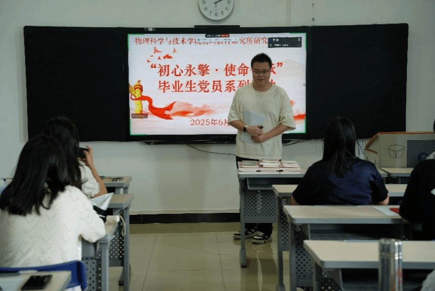 近日,物理科学与技术学院物理教育研究所研究生党支部组织开展了“初心永擎,使命传承”2025届毕业生党员主题教育活动。本次活动通过重温入党誓词、专题教育培训、经验分享交流及校史馆参观等形式,引导毕业生党员坚定理想信念,牢记初心使命,在新的征程上继续发挥党员先锋模范作用。