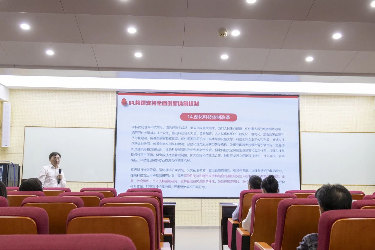 报告会上,胡宗山领学了《中国共产党第二十届中央委员会第三次全体会议公报》,围绕深刻认识党的二十届三中全会的里程碑意义、深入领悟习近平总书记在全会上的重要讲话精神、全面准确理解进一步全面深化改革的重大举措等方面,对党的二十届三中全会的精神要义和实践要求进行了系统宣讲。胡宗山重点解读了《中共中央关于进一步全面深化改革推进中国式现代化的决定》,指出了全面深化改革、推进中国式现代化之间的内在统一关系,他强调构建支持全面创新体制机制,要深化教育改革、科技体制改革,增加基础研究投入,提高基础研究水平,切实推动党的二十届三中全会精神在教育领域落地见效。