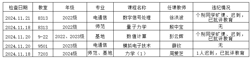 为营造良好学风,落实学生工作引领学风、监督学风的重要职责,根据物理科学与技术 学院本科生学风建设工作要求, 11月18日至11月24日,学院各年级辅导员对本科生课堂、 宿舍进行检查,学生整体表现良好,但仍存在少数违纪行为。现将检查情况通报如下: