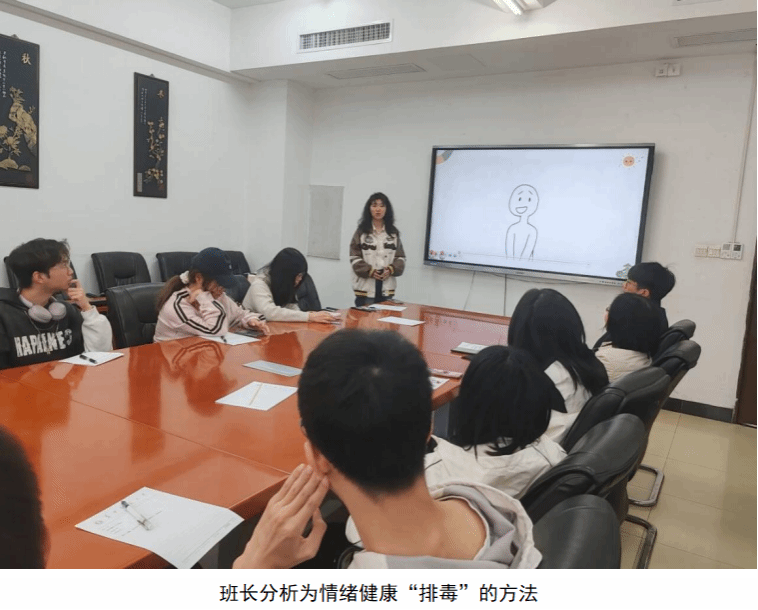 情绪管理不仅需要认识自我情绪,更需要掌握有效的调节方法。为帮助同学们更好地应对日常情绪问题,班长还分享了七种为情绪健康 “排毒” 的实用方法,比如欣赏自然美景、重温美好回忆、帮助他人等,引导大家在生活中积极运用。