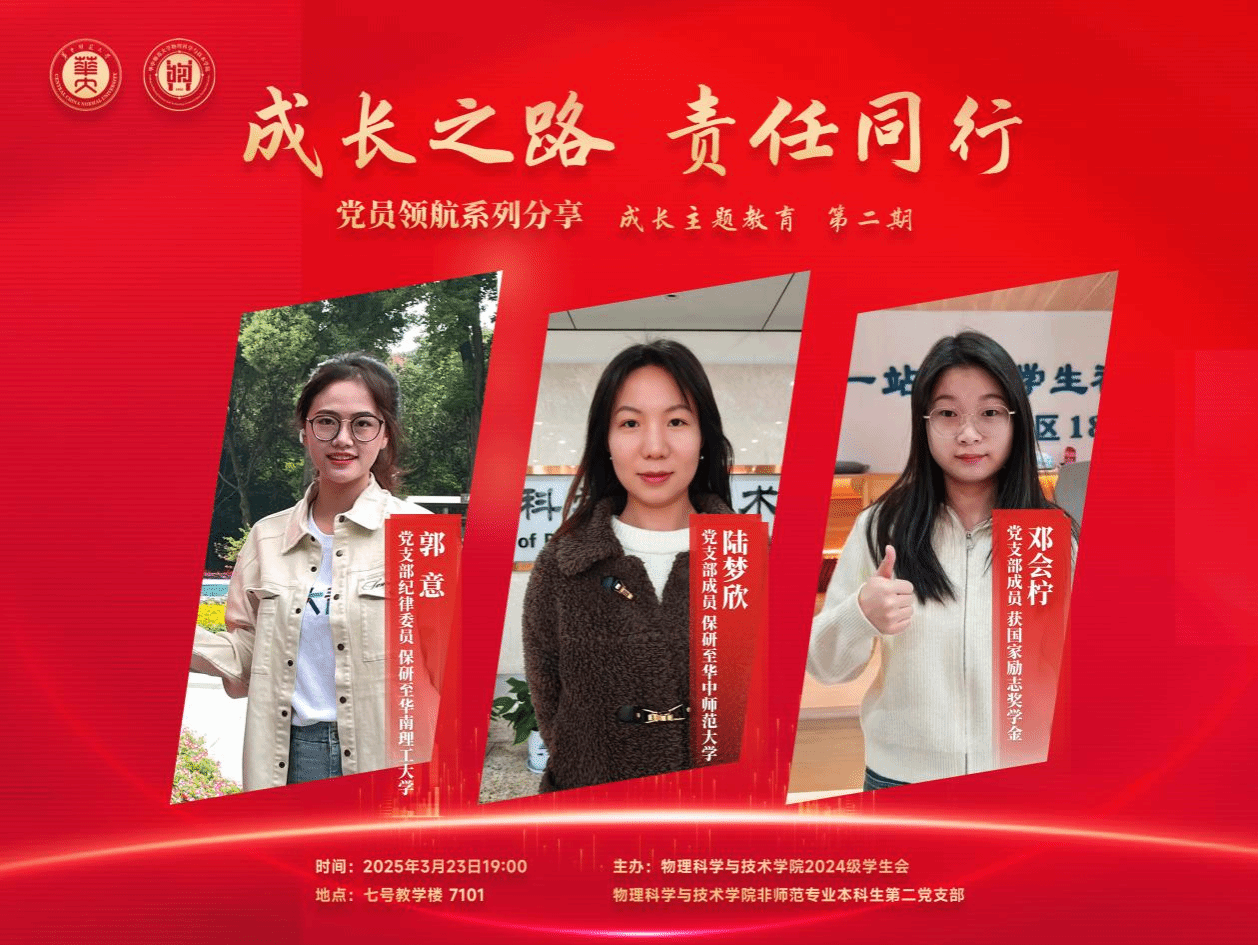 3月23日,物理科学与技术学院24级电子信息专业在7101教室开展“成长之路,责任同行”党员领航系列分享会(第二期)。本次分享会由物理科学与技术学院2024级学生会与非师范专业本科生第二党支部联合举办,辅导员余思齐主持。非师范专业本科生第二党支部党员代表郭意、陆梦欣、邓会柠与24级电子信息专业新生深入交流,围绕学习困境、考证规划等新生关注的问题答疑解惑,助力新生明确方向,开启成长新篇。