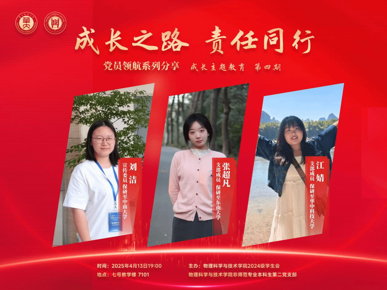 4月13日,物理科学与技术学院24级电子信息专业在7101教室开展“成长之路 责任同行”党员领航系列分享会(第四期)。本次分享会由物院2024级学生会与非师范专业本科生第二党支部联合举办,辅导员余思齐主持。活动聚焦专业分流、大学生创业创新训练以及职业规划等关键话题,邀请非师范专业本科生第二党支部的刘洁、张超凡、江婧三位优秀党员与24级电子信息专业的同学进行交流分享,结合自身经历为同学们答疑解惑。
