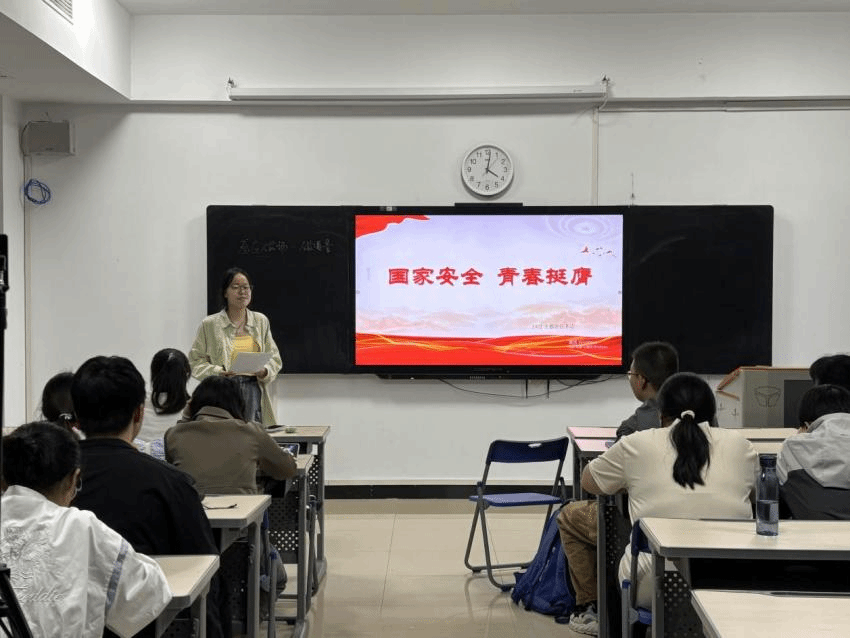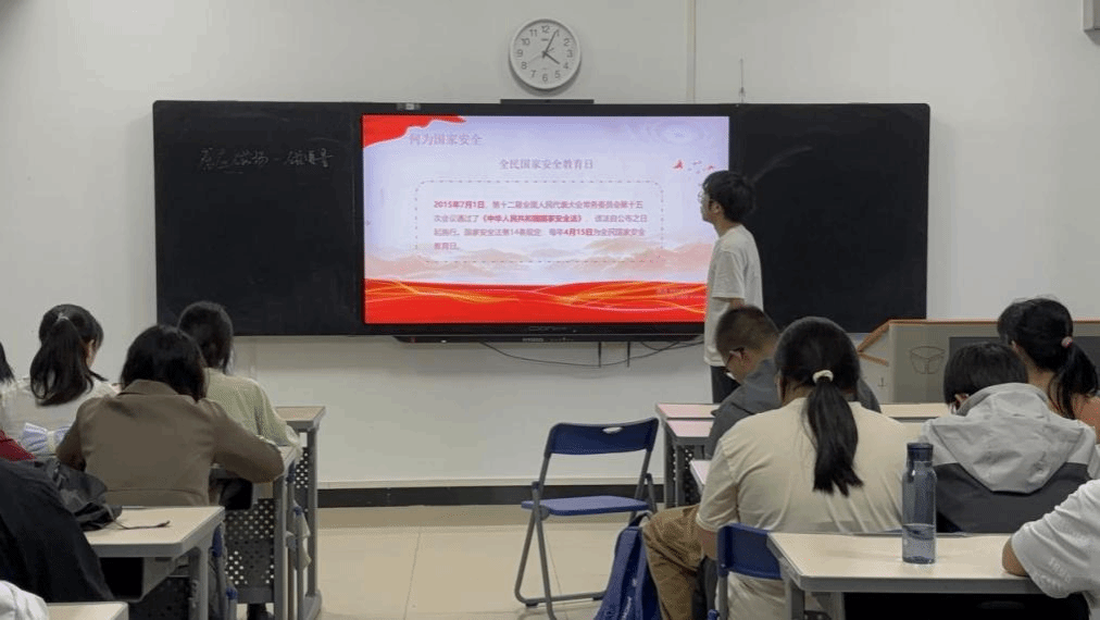 活动开始,刘孝鸿同学先通过 PPT 讲解,从国家安全的概念、内涵讲起,结合生动的案例和详实的数据,让同学们深刻体会到国家安全形势的严峻性与复杂性,阐述了国家安全与我们每一个人的紧密联系。刘孝鸿同学列举了间谍活动、网络攻击等典型行为,并详细解读了我国相关法律对这些行为的严厉制裁。刘孝鸿还提到,青年学生同样肩负保卫国家安全的重任,需凝聚合力筑牢国家安全防线。