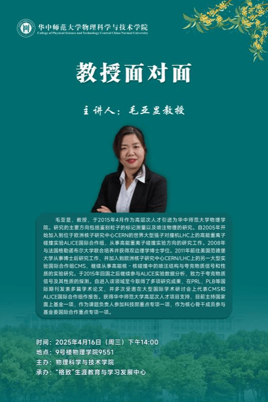 4月16日下午,物理科学与技术学院“格致”生涯教育与学习发展中心举办了“教授面对面”活动,毛亚显教授与同学们围绕教育方法与成长路径展开深入交流,探讨了基于科研驱动的自主学习模式在物理专业人才培养中的实践价值。