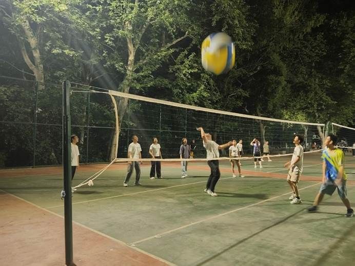 随着热身结束,趣味排球赛正式拉开帷幕。四支队伍两两分组,在两个场地同时展开比拼,比赛采用五局三胜制,各组胜出队伍开展冠亚军争夺赛,其余两队角逐季军。赛场上,队员们配合默契、斗志昂扬:有人高高跃起完成精彩扣杀,有人全神贯注稳稳接球,更有团队通过精妙战术组织进攻。此起彼伏的加油声与欢呼声,将现场氛围推向高潮。